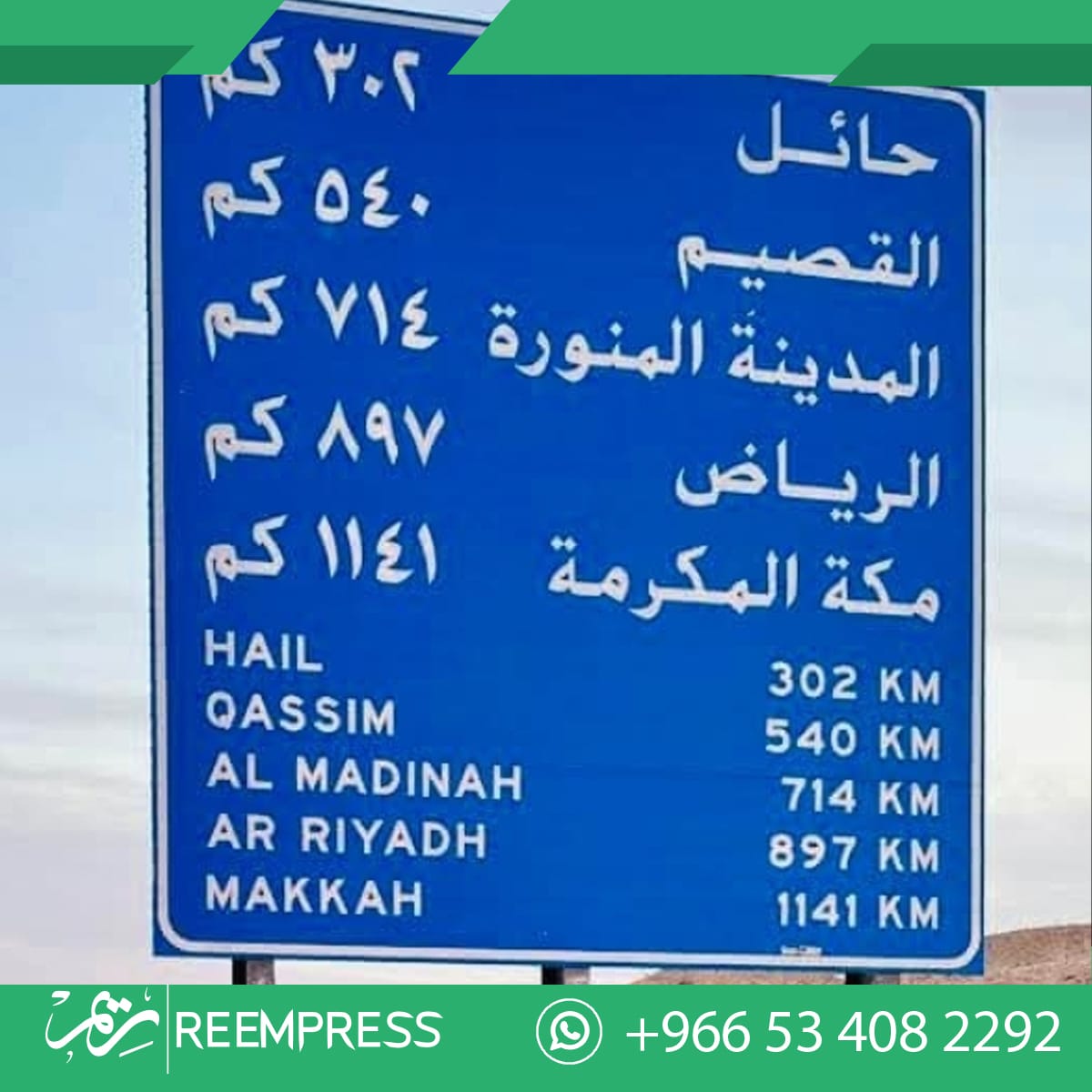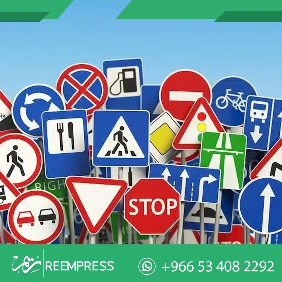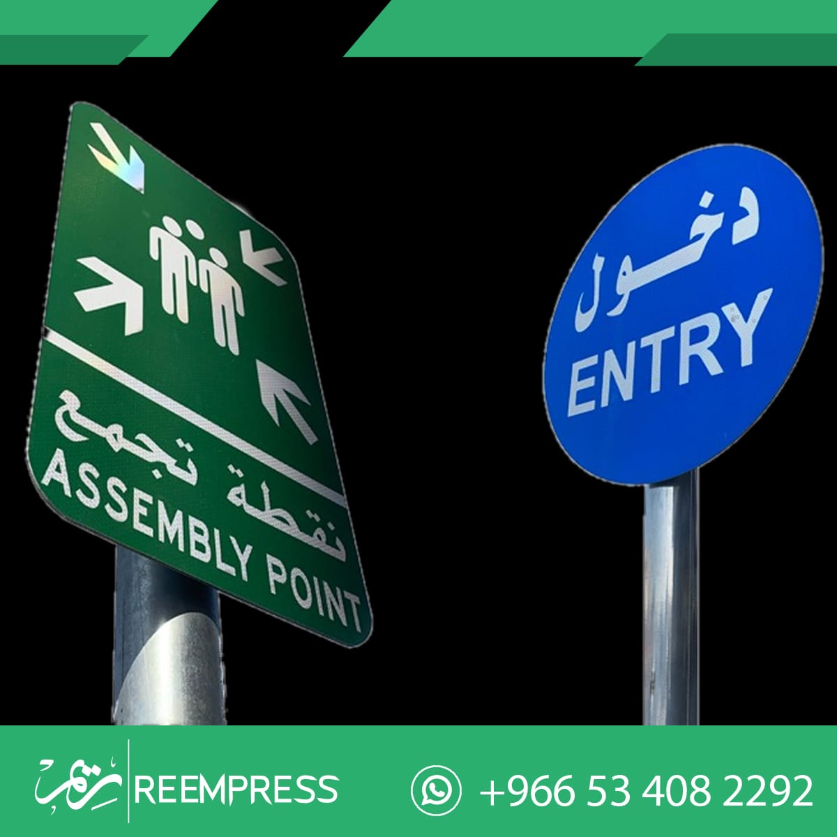لوحات إرشادية للطرق مصنعة وفقاً للمواصفات القياسية المعتمدة، مع استخدام عواكس ضوئية عالية الجودة لضمان الرؤية الليلية الواضحة.
